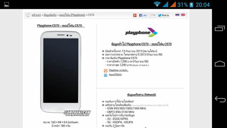 Playphone C-570 แฟบเล็ตแอนดรอยด์ รองรับการใช้งาน 2 ซิม มาพร้อมหน้าจอสัมผัสขนาดใหญ่ 5.7 นิ้ว ความละเอียด 720x1280 พิกเซล, กล้องหลังความละเอียด 13 ล้านพิกเซล พร้อมแฟลช LED ขับเคลื่อนด้วยหน่วยประมวลผล MTK6589 Quad Core ความเร็ว 1.2 GHz, RAM 1 GB, หน่วยความจำภายใน 4 GB รองรับการ์ด MicroSD สูงสุด 32 GB, รันบนระบบปฏิบัติการแอนดรอยด์ 4.2.1 Jelly Bean และความจุแบตเตอรี่ 2800 mAh