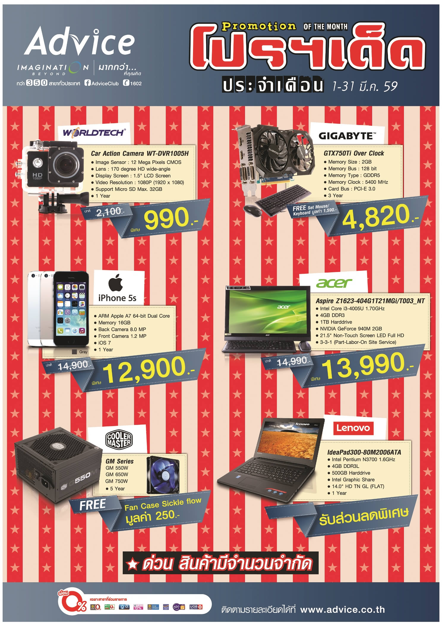 แอดไวซ์ (Advice) แหล่งรวมสินค้าไอที และสมาร์ทโฟนรายใหญ่ ที่มีเครือข่ายครอบคลุมกว่า 350 สาขาทั่วประเทศไทย จัดโปรโมชั่นพิเศษตลอดเดือนมีนาคม 2559 เอาใจลูกค้าคอไอที ด้วยสินค้าเด็ด 6 รายการดังต่อไปนี้