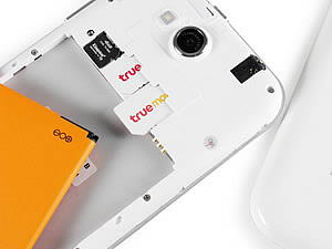 เมื่อเปิดฝาหลังออกมาจะพบกับช่องใส่ซิมการ์ดขนาดปกติ miniSIM (SIM 1) และ miniSIM (SIM 2) ถัดมามีช่องเสียบการ์ดหน่วยความจำภายนอก MicroSD นอกจากนี้จะพบช่องวางแบตเตอรี่ความจุ 2800 mAh ที่สามารถถอดเข้า-ออกได้