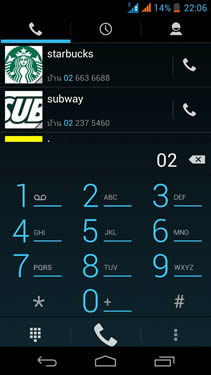 หน้าการใช้งานโทรศัพท์ จะแบ่งออกเป็น 3 หมวด ได้แก่ แป้นพิมพ์ตัวเลข, บันทึกการโทร และรายชื่อผู้ติดต่อ โดยเมื่อกดโทรออกจะแสดงชื่อ, เบอร์โทร, ซิมที่ใช้งาน, รูป (ถ้ามี) ซึ่งจะมาพร้อมปุ่มควบคุมการทำงานต่างๆ ได้แก่ ปุ่มวางสาย, แป้นพิมพ์ตัวเลข, ลำโพง, ปิดเสียง,พักสาย และเพิ่มผู้ติดต่อ
