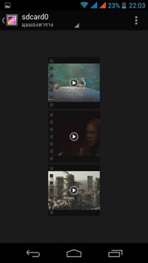 เครื่องเล่นวิดีโอรองรับไฟล์รูปแบบ MPEG-4, 3GP, AVI สามารถเรียกดูได้จากในแกลเลอรี่ >> เลือกอัลบั้มวิดีโอ โดยในอัลบั้มวีดีโอจะแสดงรูปตัวอย่างเคลื่อนไหวของวีดีโอแต่ละอัน