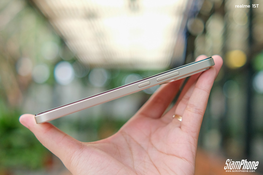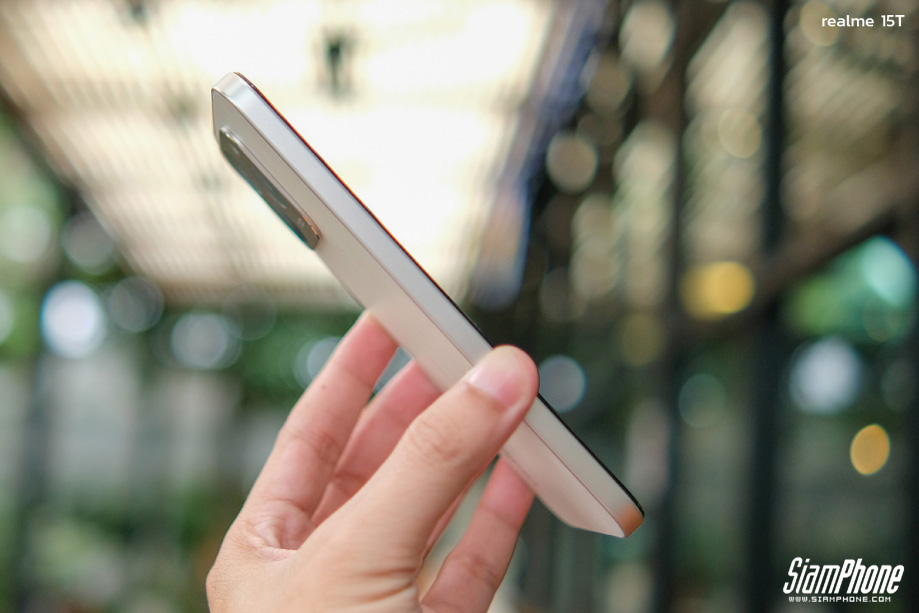 สัมผัสแรกกับ realme 15T ให้ความรู้สึกพรีเมียมเกินราคา ด้วยดีไซน์ขอบตัวเครื่องแบบเหลี่ยม (Flat-edge) ที่ดูทันสมัยและจับถือได้กระชับมือ
