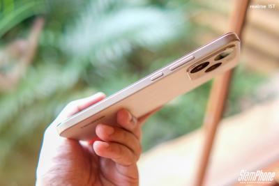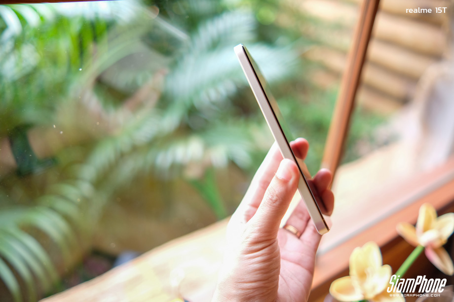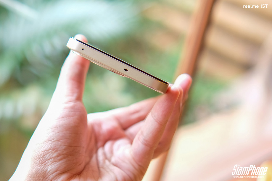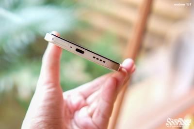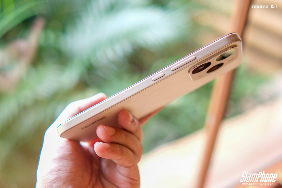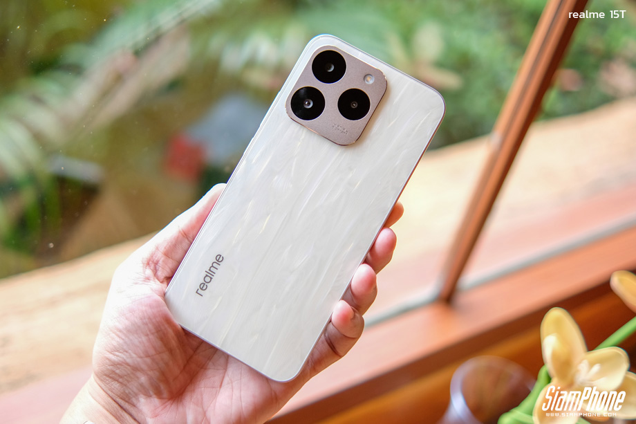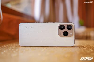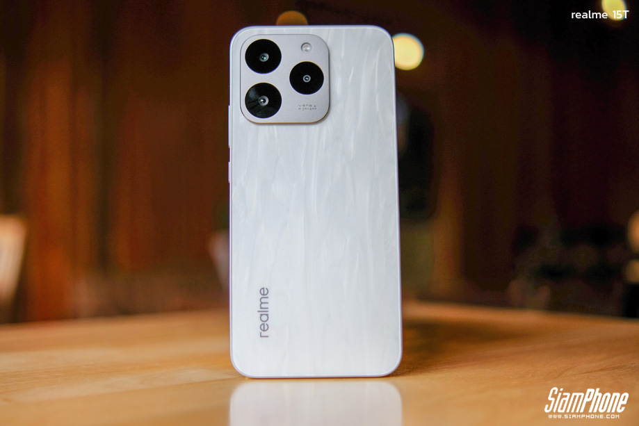 ด้านการออกแบบ realme 15T ใช้ผิวสัมผัสแบบ Textured Matte 4R ที่ช่วยลดรอยนิ้วมือและเพิ่มความกระชับในการถือ ตัวเครื่องมีโมดูลเลนส์อะลูมิเนียมอัลลอยที่ดูหรูหรา งานประกอบเซลลูลอยด์ระดับเรือธง โดยเฉพาะสี Flowing Silver ที่มีพื้นผิวเป็นเอกลักษณ์เฉพาะในแต่ละเครื่อง ถึงแม้จะใส่แบตใหญ่ 7,000mAh แต่ก็ยังบางและเบากว่าเรือธงบางรุ่นอีกด้วย