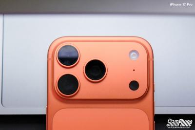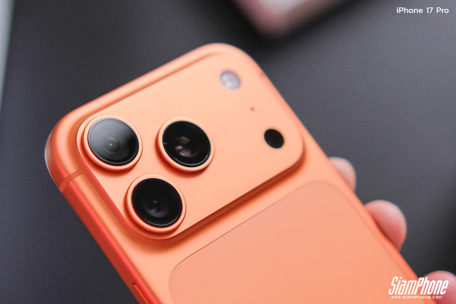 พลิกมาที่ฝาหลัง iPhone 17 Pro จะพบกับโมดูลกล้องสี่เหลี่ยมผืนผ้าขนาดใหญ่ ทางซ้ายของโมดูลมีกล้องหลัง 3 ตัว ประกอบไปด้วยกล้องหลัก Fusion ความละเอียด 48MP, กล้อง Ultra-Wide Fusion ความละเอียด 48MP และกล้อง Telephoto Fusion ความละเอียด 48MP ส่วนทางขวาของโมดูลบนสุดเป็นไฟแฟลช LED ถัดลงมาเป็นรูไมโครโฟน และล่างสุดตรงรูดำๆ เป็นเซนเซอร์วัดระยะ LiDAR นอกจากนี้ตรงฝาหลังยังมีพื้นที่แม่เหล็กสำหรับติดกระเป๋าตัง MagSafe และครอบทับด้วยกระจก Ceramic Shield เพิ่มความทนทานให้ด้านหลัง