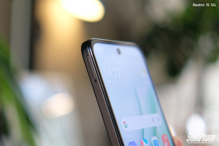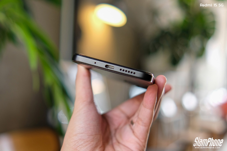 สัมผัสแรกกับ Redmi 15 5G ให้ความรู้สึกที่แข็งแรงและมีงานประกอบที่แน่นหนาเกินราคา แม้จะมีแบตเตอรี่ขนาดใหญ่ แต่ตัวเครื่องยังคงความบางไว้ที่ 8.40 มม. และน้ำหนัก 217 กรัม ซึ่งถือว่าสมดุลเมื่อเทียบกับขนาดหน้าจอและแบตเตอรี่ ดีไซน์ฝาหลังโค้งมนช่วยให้การจับถือเข้ากับอุ้งมือได้ดี แม้ตัวเครื่องจะมีขนาดใหญ่ก็ตาม