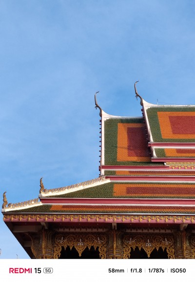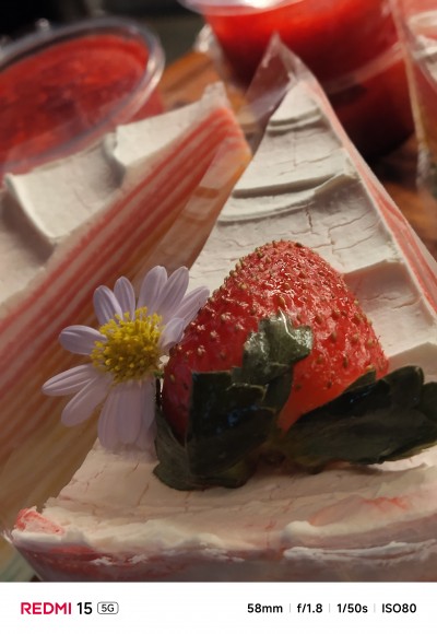 ในส่วนของกล้อง Redmi 15 5G มาพร้อมชุดกล้องหลังคู่ AI ความละเอียด 50MP ใช้เลนส์ 5P รูรับแสงกว้าง f/1.8 ช่วยในการถ่ายภาพในสภาวะแสงน้อยได้ดีขึ้น เพียงพอสำหรับการบันทึกภาพในชีวิตประจำวันทั่วไป ส่วนกล้องหน้าให้มาที่ความละเอียด 8MP (f/2.0) รองรับการถ่ายวิดีโอสูงสุด 1080p ที่ 30fps ทั้งกล้องหน้าและหลัง นอกจากนี้ ซอฟต์แวร์กล้องยังมีเครื่องมือ AI สุดสร้างสรรค์เพื่อช่วยในการตัดต่อภาพและวิดีโอให้ง่ายดายยิ่งขึ้น