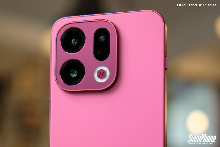 ดีไซน์โมดูลกล้อง: ชุดเลนส์กล้องถูกจัดวางในโมดูลวงกลมขนาดใหญ่ที่นูนขึ้นมาจากฝาหลังเล็กน้อย ภายในมีการจัดวางเลนส์อย่างสมดุล พร้อมประทับโลโก้ตัวอักษร "H" ที่สื่อถึงความร่วมมือกับ Hasselblad อย่างชัดเจน และวงแหวนรอบเลนส์ที่มีรายละเอียดการเล่นแสงเงาสวยงาม