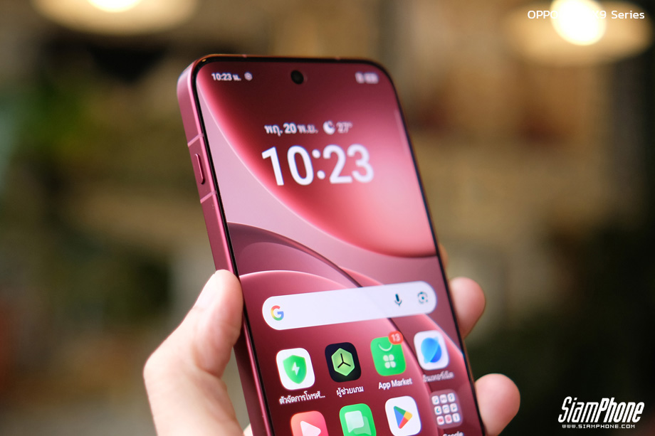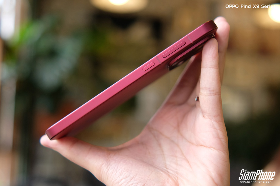 วัสดุและการเก็บงาน: ฝาหลังโดดเด่นด้วยโทนสีแดง Velvet Red ที่มีผิวสัมผัสแบบด้านเนียนละเอียด ช่วยลดรอยนิ้วมือและให้สัมผัสที่นุ่มนวล ตัดกับความเงางามของกรอบโลหะรอบตัวเครื่องที่ทำสีแดงโทนเดียวกันอย่างกลมกลืน