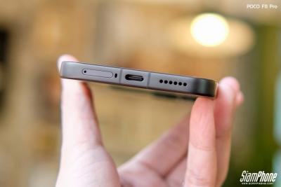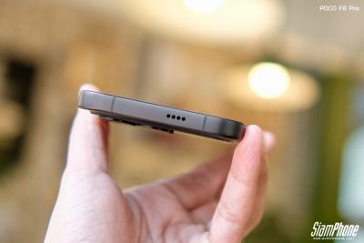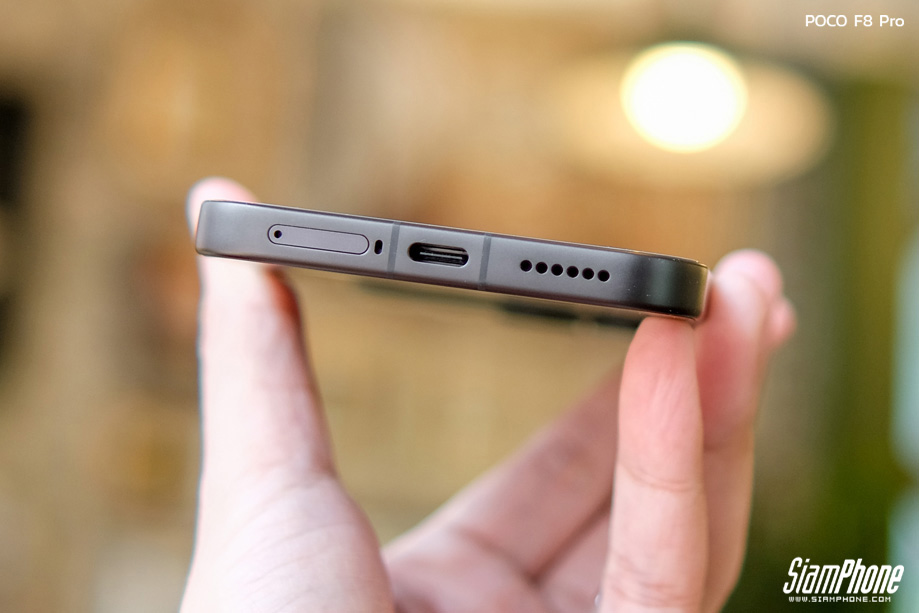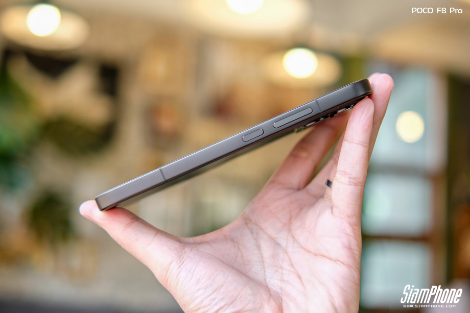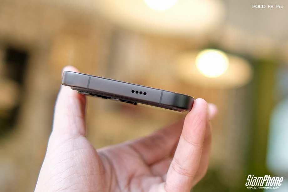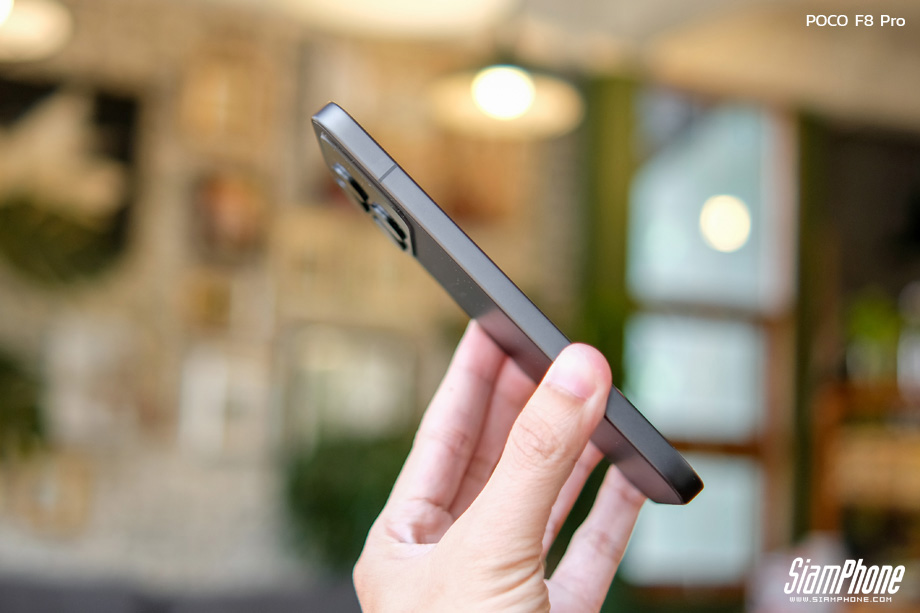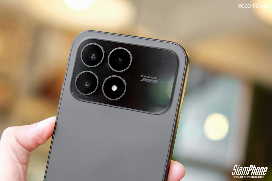 จากการสัมผัสตัวเครื่องจริง POCO F8 Pro สิ่งแรกที่สะดุดตาคือดีไซน์ฝาหลังที่ดูพรีเมียมและแปลกตา การใช้เทคนิคกระจกชิ้นเดียวขึ้นรูปทำให้ฝาหลังดูเป็นชิ้นเดียวกันอย่างไร้รอยต่อ พื้นผิวมีผิวสัมผัสแบบด้านให้ความรู้สึกละมุนมือ ช่วยลดรอยนิ้วมือได้ดี ตัดกับบริเวณโมดูลกล้องด้านบนที่มีความเงางาม สร้างมิติความตัดกันที่สวยงามลงตัว บริเวณโมดูลกล้องมีการสกรีนโลโก้ SOUND BY BOSE ไว้อย่างภาคภูมิใจ โดยมีให้เลือก 3 สี ได้แก่ Titanium Silver, Blue และ Black