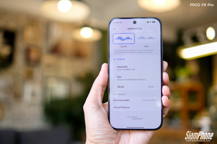 อีกหนึ่งไฮไลท์ที่ไม่พูดถึงไม่ได้คือระบบเสียง Sound by Bose ที่ POCO ร่วมมือกับวิศวกรเสียงจาก Bose ในการปรับจูนลำโพงคู่แบบสมมาตร Symmetric 1115F ให้มิติเสียงที่โอบล้อมและสมดุล ไม่ว่าจะเป็นโหมด Dynamic ที่ให้เบสหนักแน่น หรือ Balanced ที่เน้นเสียงร้องคมชัด รองรับทั้งเสียงความละเอียดสูงและระบบเสียงรอบทิศทาง Dolby Atmos เต็มรูปแบบ